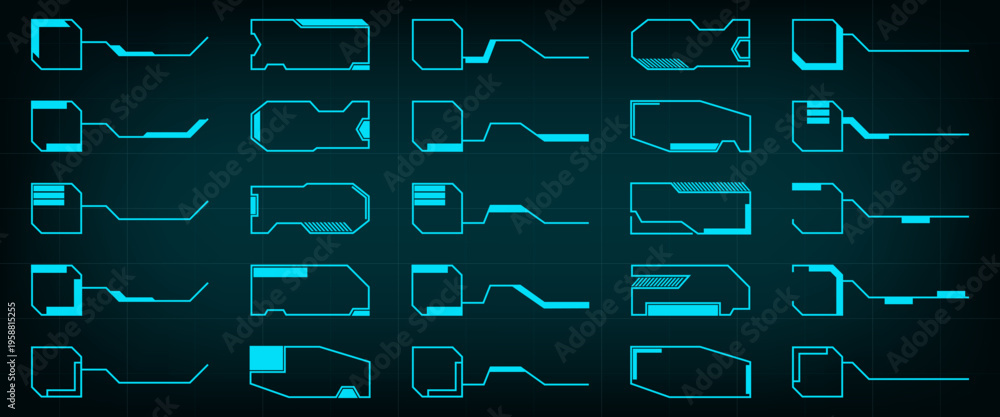 Futuristic frames collection. Neon blue tech shapes with circuit style outlines. Sci fi interface elements for digital panels, hud and technology design #1958815255