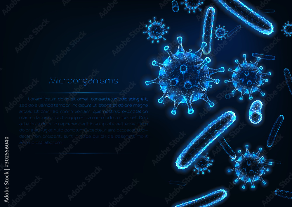 Futuristic immunology web banner with glowing low polygonal virus and bacteria cells. #302556040