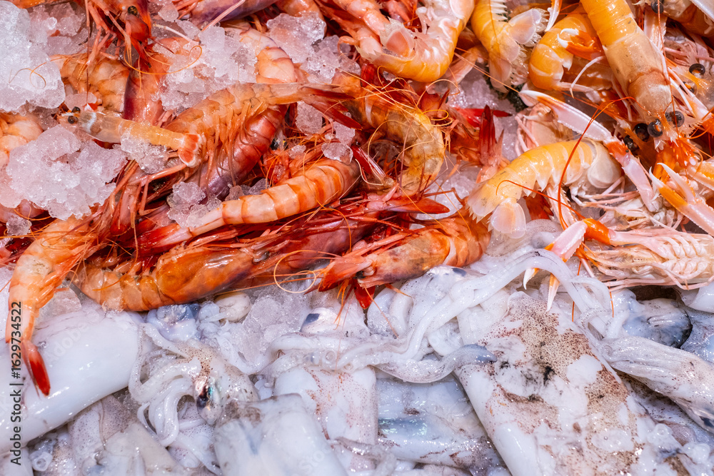 Gambas y sepia. Prodcuto de pescadería fresco. #1629734522