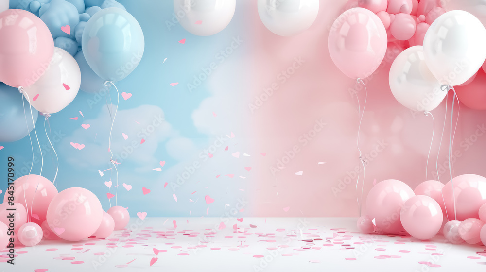 gender reveal party background with blue and pink balloons and hearts #843170999