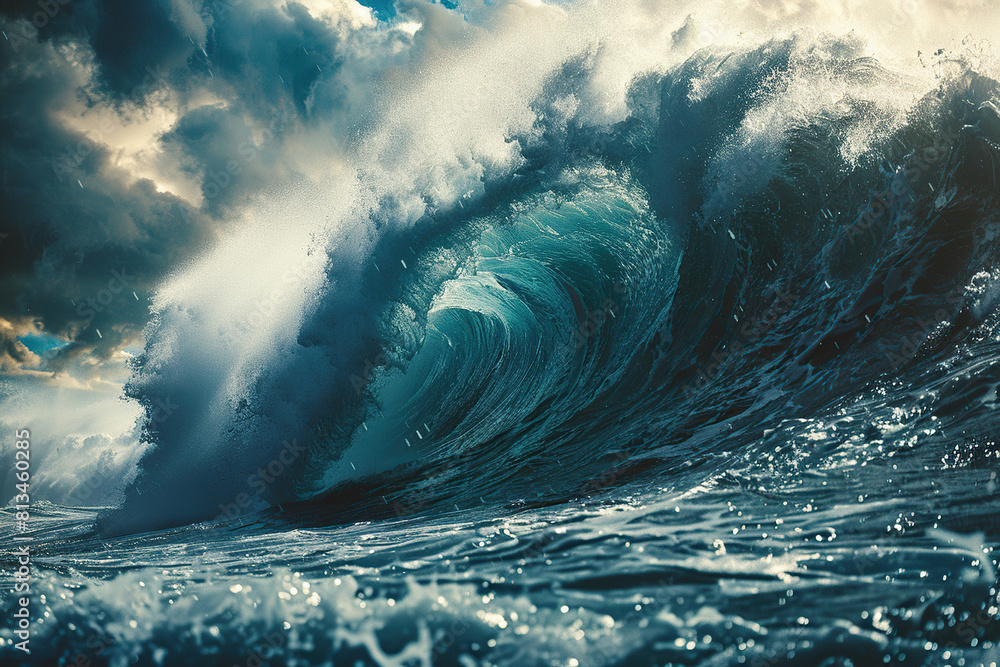 Generative ai on theme of a scary tsunami with huge foamy wave, apocalyptic dramatic background #813460285