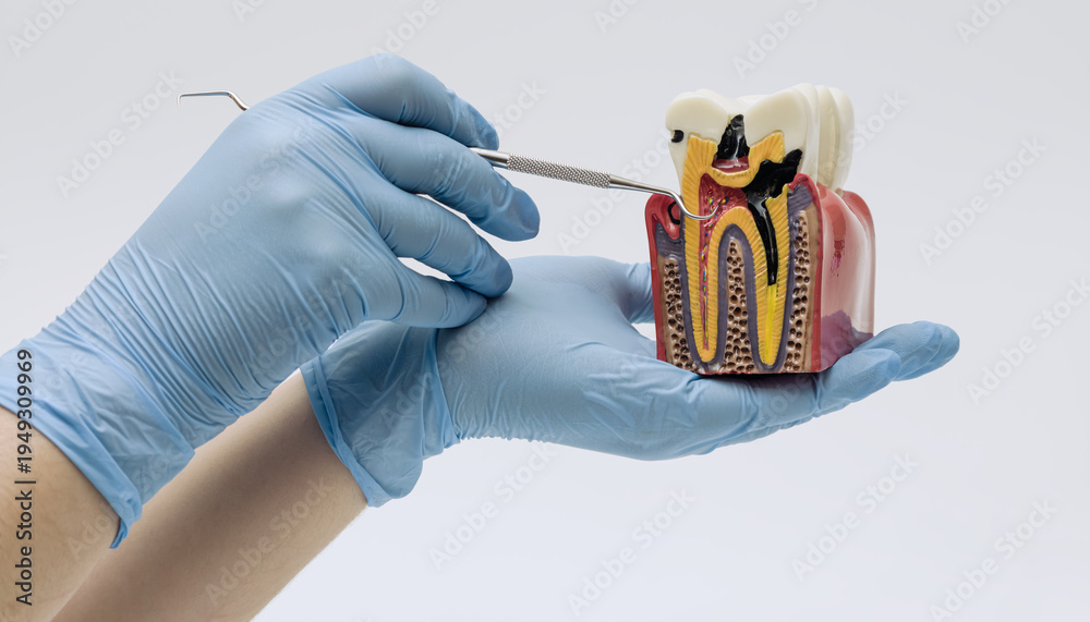 Gloved hands holding a detailed tooth cross section model, illustrating cavity development and internal tooth structure for dental education and healthcare training. #1949309969