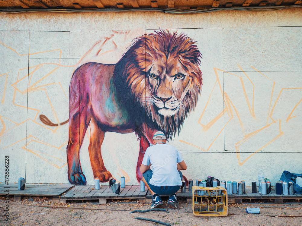 Graffiti Artist Painting On The Street Wall. Man with aerosol spray bottle near the wall. Young talented guy in protective mask drawing colorful lion. #173556228