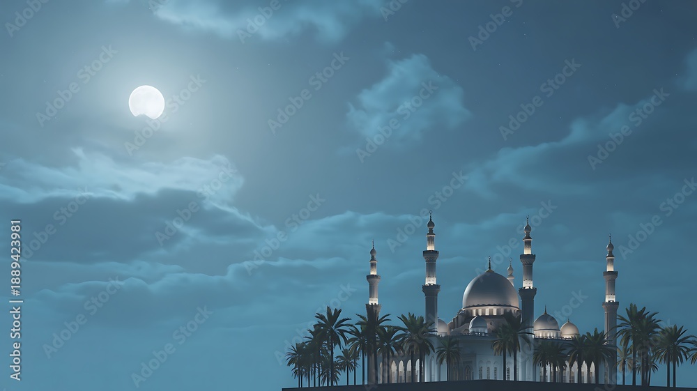Grand mosque with minarets under full moon and night sky #1889423981