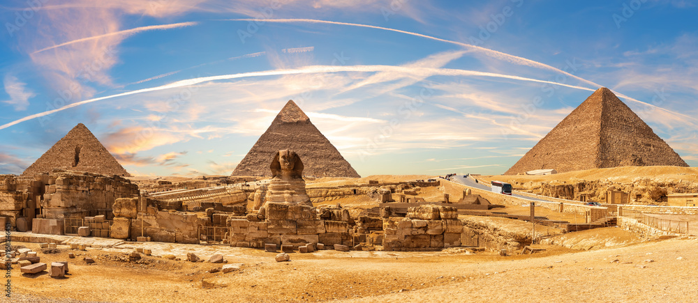 Great Sphinx and the Pyramids of Giza, beautiful sunset panorama of Cairo region, Egypt #1958246451