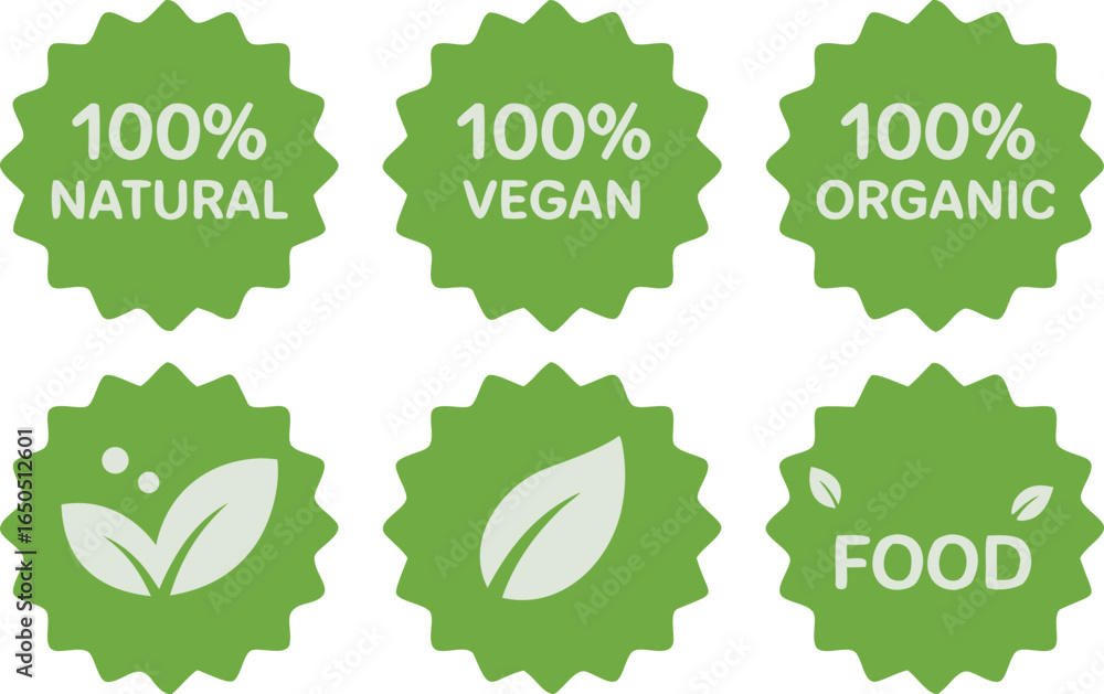 Green EcoFriendly Badges 100% Natural, Vegan, Organic, PlantBased, and Raw Food Icons Set #1650512601