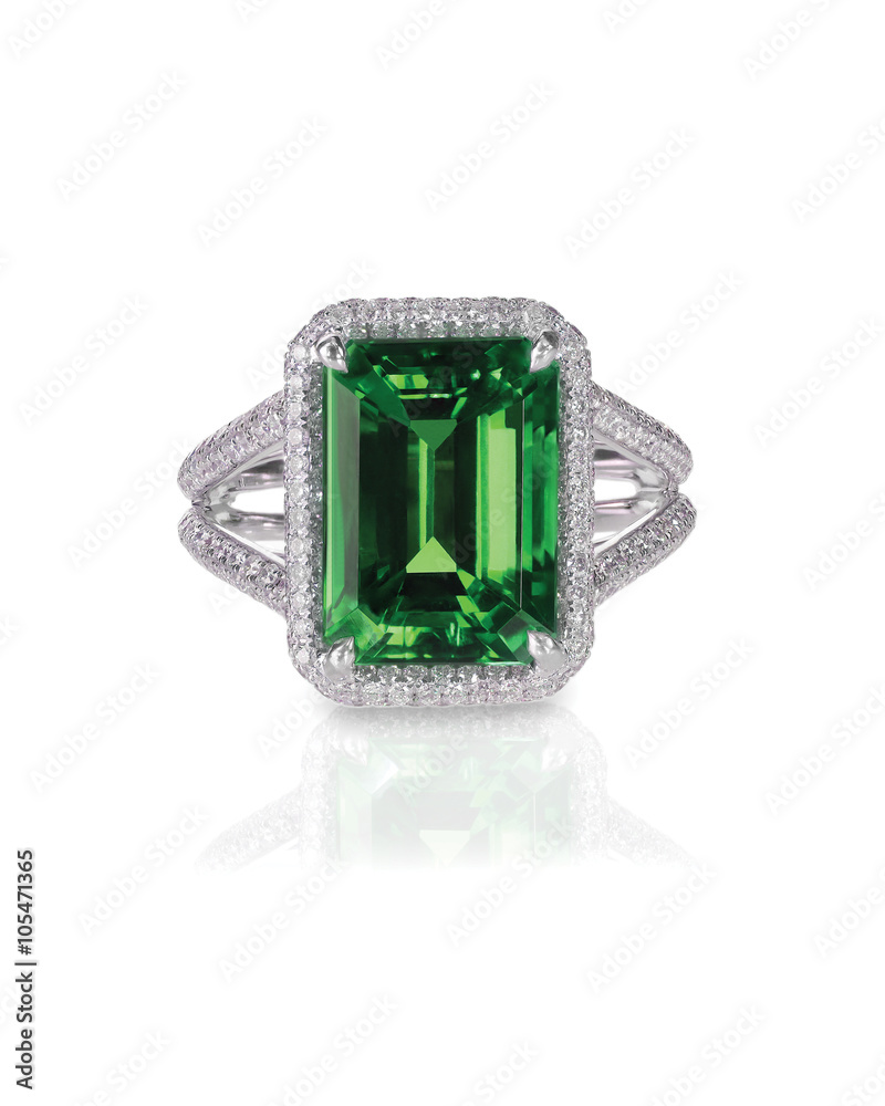 green emerald fashion engagement diamond ring band isolated on white #105471365