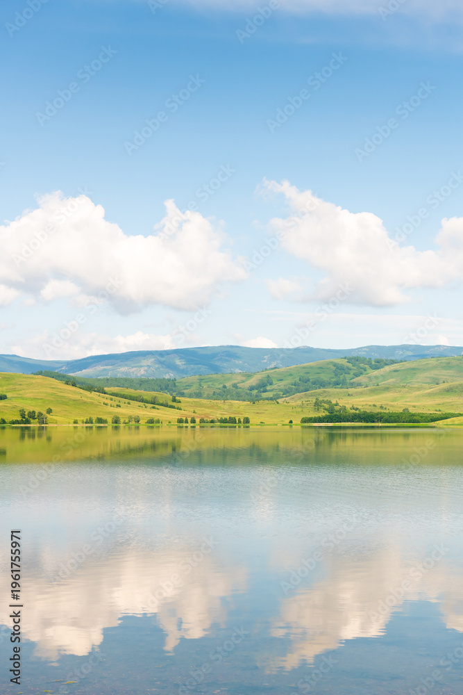 Green mountains and the blue sky with clouds are reflected in the lake. Beautiful summer landscape. #1961755971