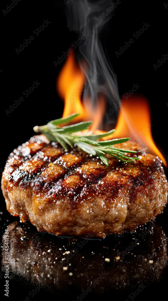 Grilled Beef Burger Patty with Flames – Generative AI #1945411981
