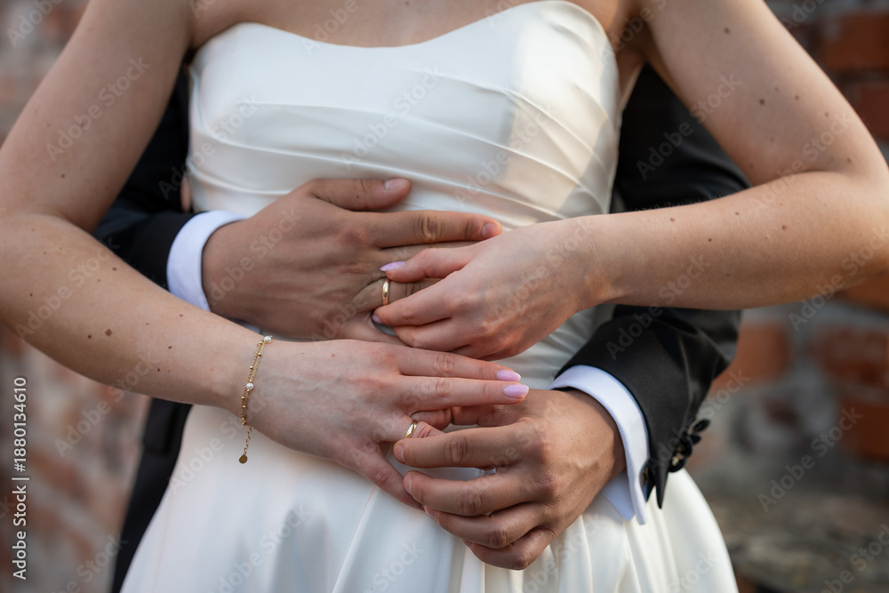 Groom embracing bride from behind while showing wedding rings on their fingers with a rustic brick wall in the background during a wedding photoshoot. #1880134610