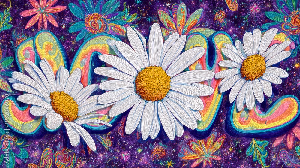 Groovy banner features daisy flowers, a psychedelic background, and vintage lettering. Hippie art has a 1970s feel. #1932046070