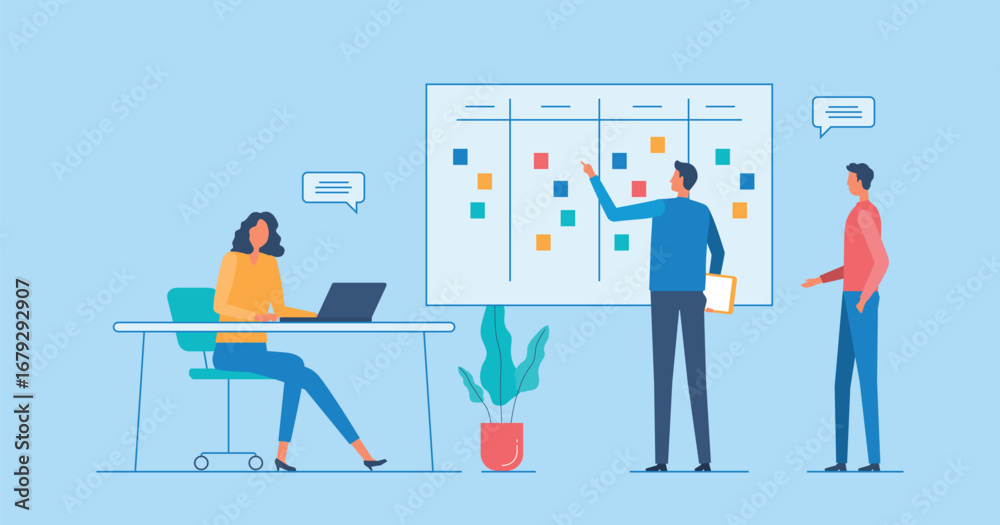 group business people team meeting talking working brainstorming for Business marketing planning concept with color sticky note on schedule board. set cartoon character design. Flat illustration #1679292907