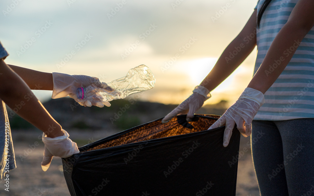 Group of kids school volunteer charity environment, Improving environment. Kind eco-friendly volunteers holding packets and gathering garbage #745235750