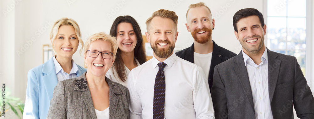 Group portrait showcasing happy and smiling coworkers in an office, emphasizing teamwork, professional success, and team collaboration between people within a thriving business community. #1771102326