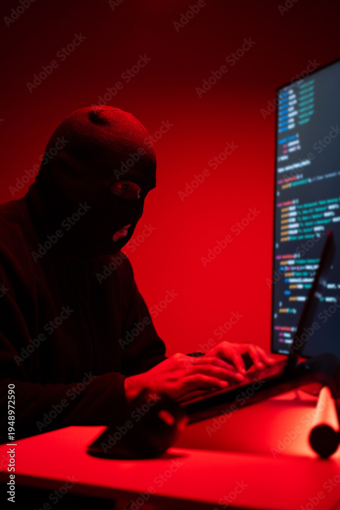 Hacker in balaclava with an obscured face is stealing data, representing cybercrime, hacking, dark web activity, and online security threats. Cyber Security concept. #1948972590