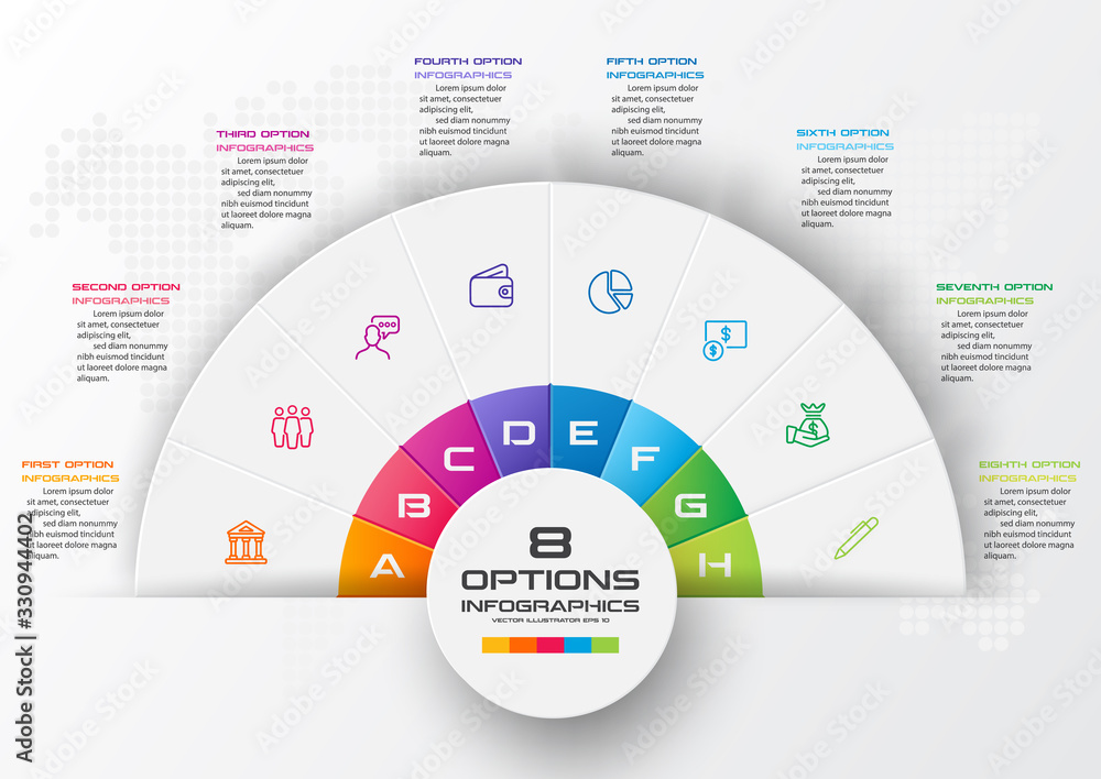 Half business circle infographics 8 steps,Abstract design element,Vector illustration. #330944402
