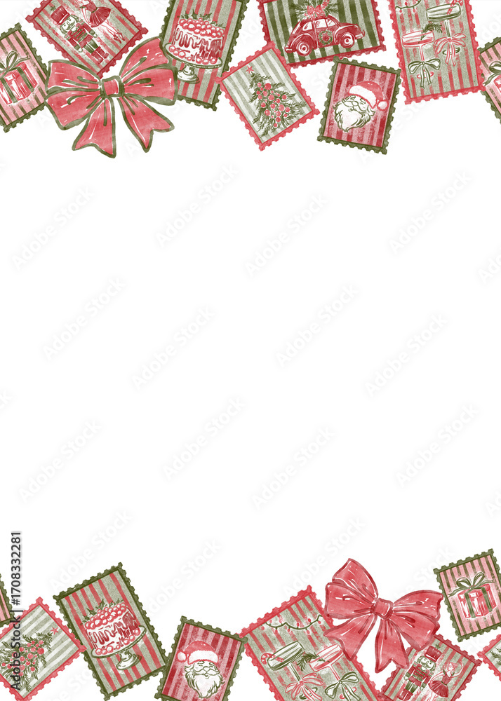 Hand-drawn seamless Christmas border with vintage postage stamps. Watercolor retro holiday illustration with Santa, nutcracker, and bow, isolated on white background #1708332281