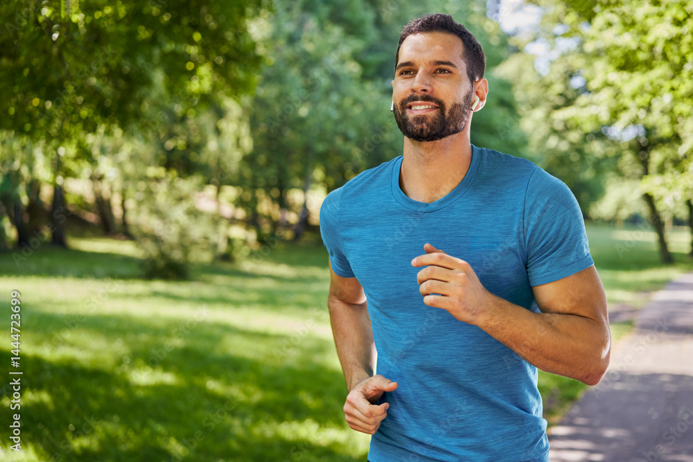 Handsome man running in park with earphones #1444723699