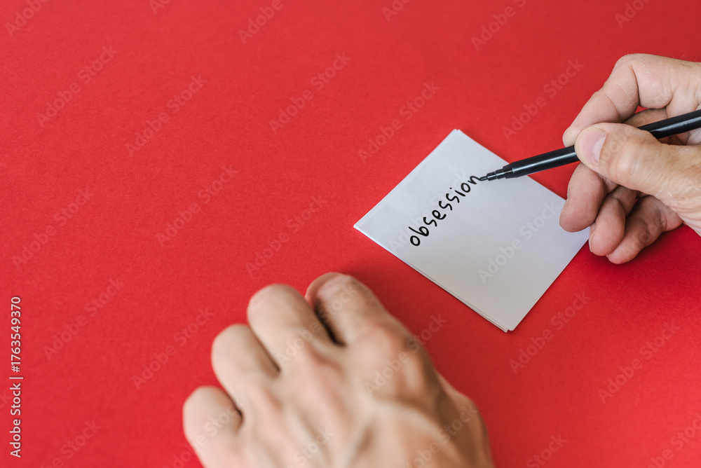 Handwriting text "Obsession" on sticky note isolated on red background. Writing message on red paper, representing intense focus or single-minded drive #1763549370