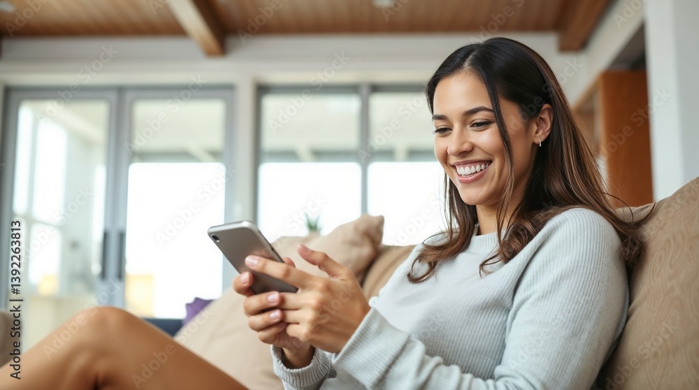Happy beautiful woman checking social media holding smartphone sitting on a sofa at home. #1392263813