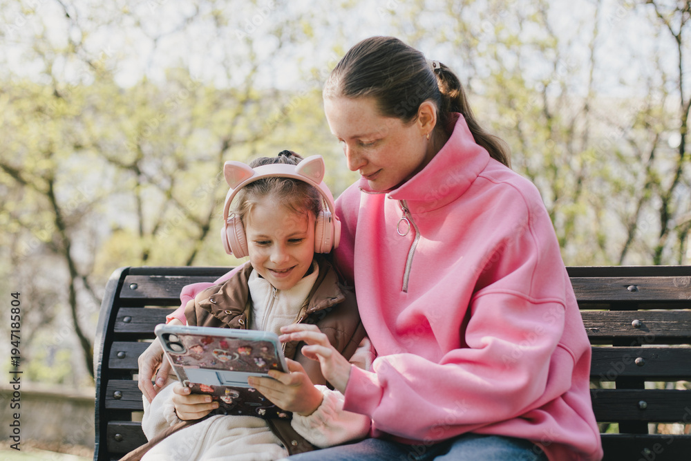 Happy mother and daughter sitting on a park bench watching tablet. #1947185804