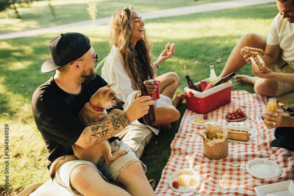 Happy people having picnic with hot dogs and cold drinks, sitting on a plaid in a park. #1304560139