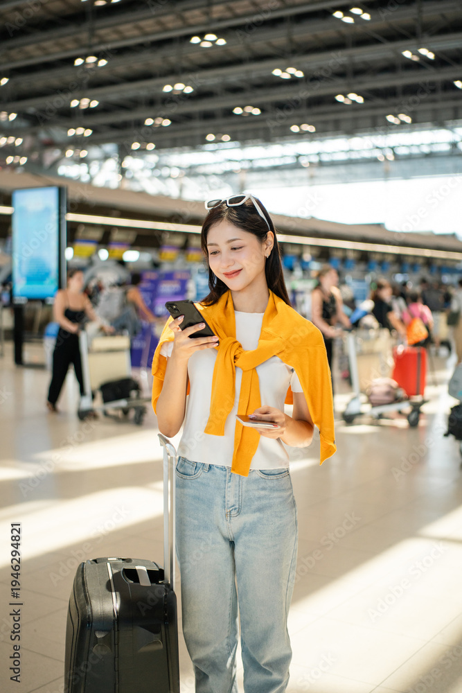 Happy young asian woman traveler holding boarding pass ticket, passport and smartphone at the airport terminal with her luggage and smiling at camera, cheerful tourist female having holiday trip. #1946294821