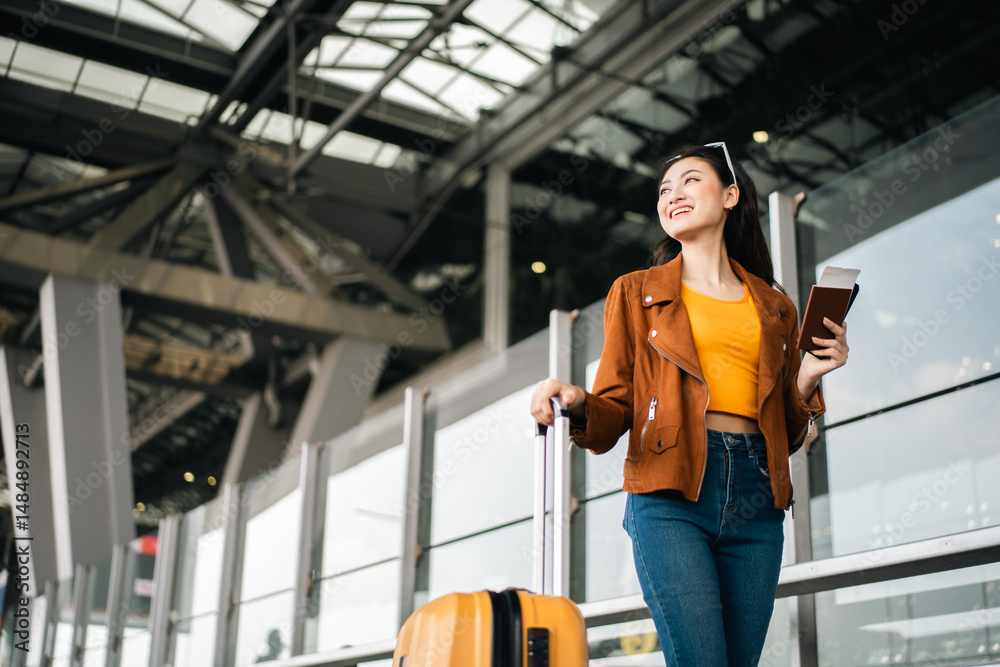 Happy young asian woman traveler using smartphone and holding boarding pass while standing at the airport terminal ready for vacation trip, smiling female tourist with confidently travel insurance #1484892713