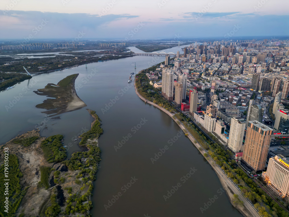 Harbin, CHINA-MAY 05, 2025-Aerial cityscape of Harbin's downtown, is the capital of Heilongjiang, China. It is the largest city of Heilongjiang #1793150233