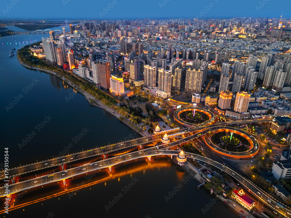 Harbin, CHINA-MAY 05, 2025-Aerial cityscape of Harbin's downtown, is the capital of Heilongjiang, China. It is the largest city of Heilongjiang #1793150544