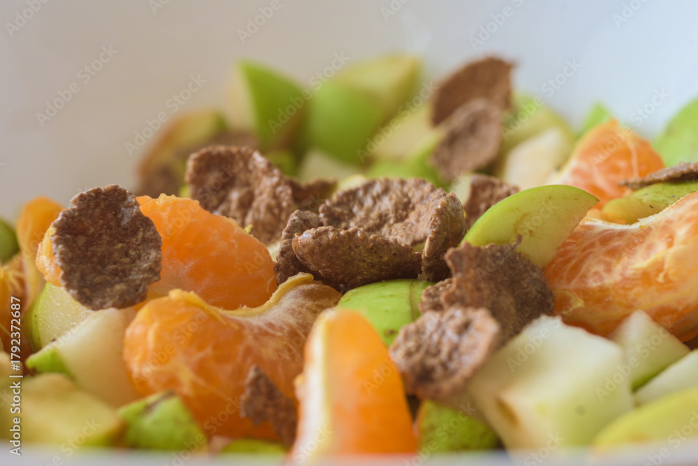 Healthy breakfast with fruit salad and muesli, closeup photo. Bran flakes on top of chopped fruits in bowl, healthy breakfast concept #1792372687