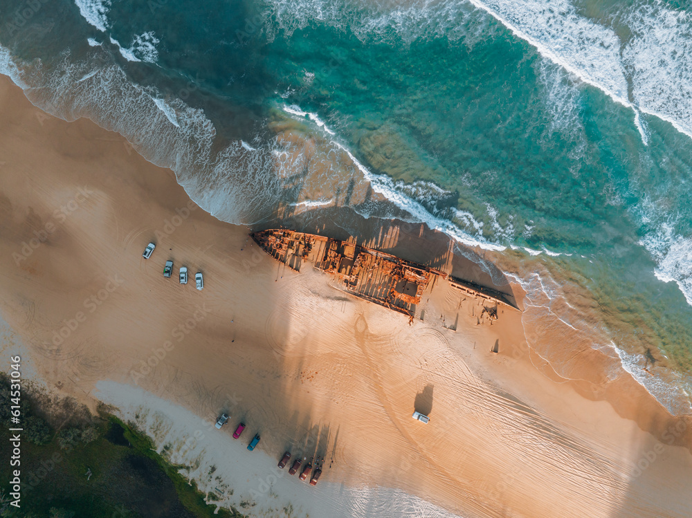 High angle aerial bird's eye drone view of the Maheno shipwreck on Seventy-Five Mile Beach on Fraser Island, Queensland, Australia. Beautiful sunset light with waves. #614531046