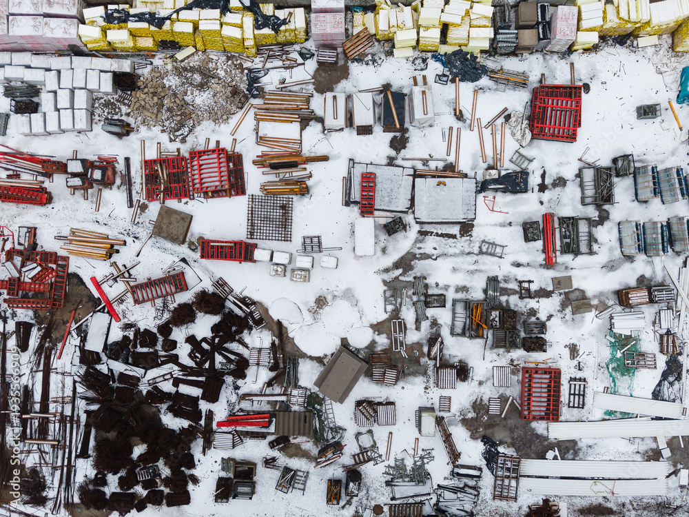 High angle aerial view of a construction site or industrial storage yard with various materials and equipment scattered on snow-covered ground. #1935566909
