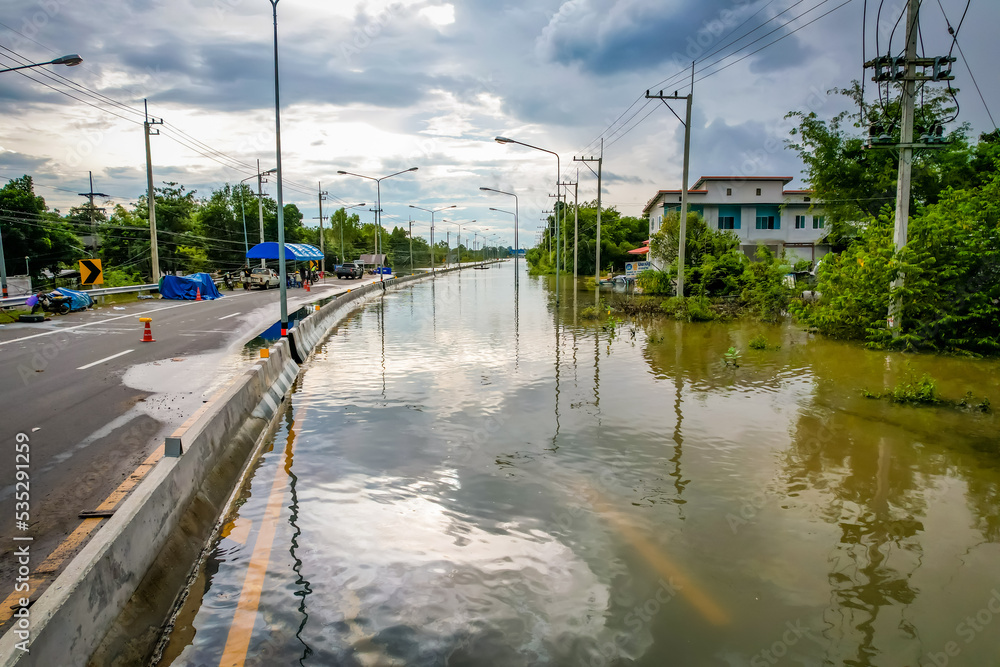 High-angle view of the Great Flood, Meng District, Thailand, on October 3, 2022, is a photograph from real flooding. With a slight color adjustment #535291259