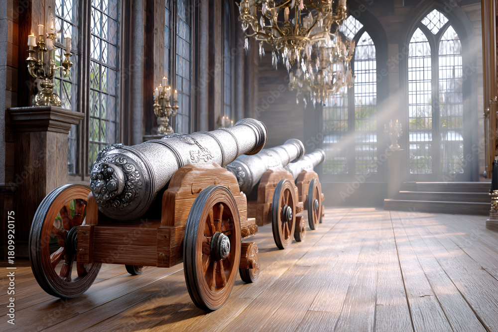 Historical cannons in an elegant castle hall with sunlight streaming through windows #1809920175