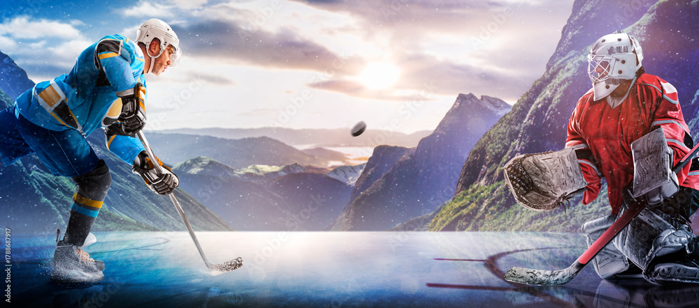 Hockey players in action on the ice. Outdoor game. Sports. Hockey match. A large hockey rink in the middle of an forest. Hockey concept. Panorama #1788687917