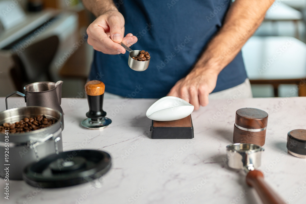 Home Barista Pouring Coffee Beans From A Scoop Into A Measure Bowl #1926510841