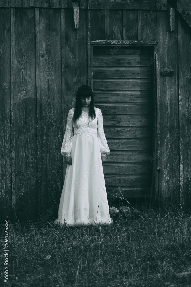 Horror scene of woman in white dress. Bluish vintage look #594775354