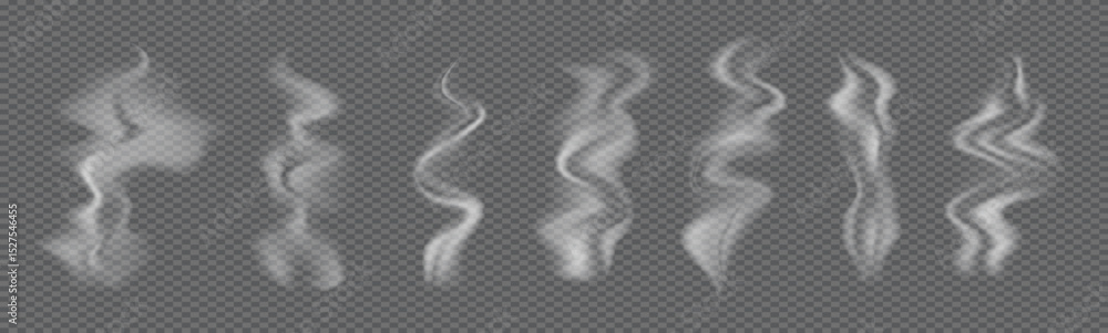 Hot food Steam, cigarette Vapor. Mist wavy cloud set. Smoke from coffee cup. Set of vector icons isolated. Realistic smoky cloud #1527546455