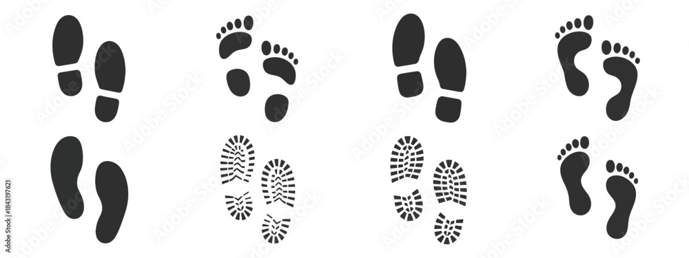 Human foot and shoe print icons set, featuring clean walking and footprint symbols, minimal design elements, and clear shapes isolated on white background for signage, education, #1843197621