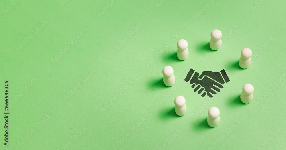 Human shaped wooden doll with handshaking icon for business team building concept. employment headhunting, candidate, human resources management and teamwork #666648305