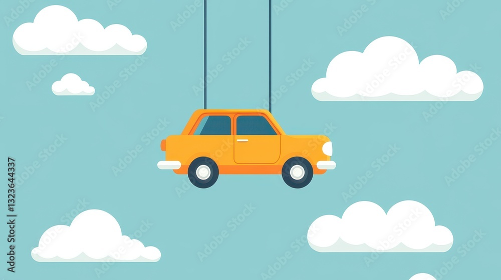 Illustrative Scene of an Orange Car Suspended in the Sky with Playful White Clouds in a Light Blue Backdrop Featuring Simple Cartoon Style #1323644337