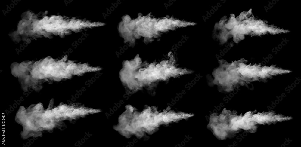 Includes close-up shots of abstract white steam or smoke rising upwards. From humidifying spray isolated on black background. #850320537