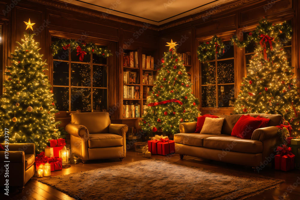 interior of living room decorated for Christmas night, beautiful Christmas tree with decorations and lights and gifts, festive background for the New Year holiday #1764393717