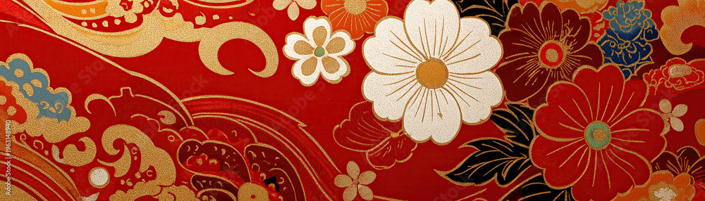 Intricate gold embroidered floral motifs woven across vibrant red traditional Chinese ceremonial silk brocade. #1963148940