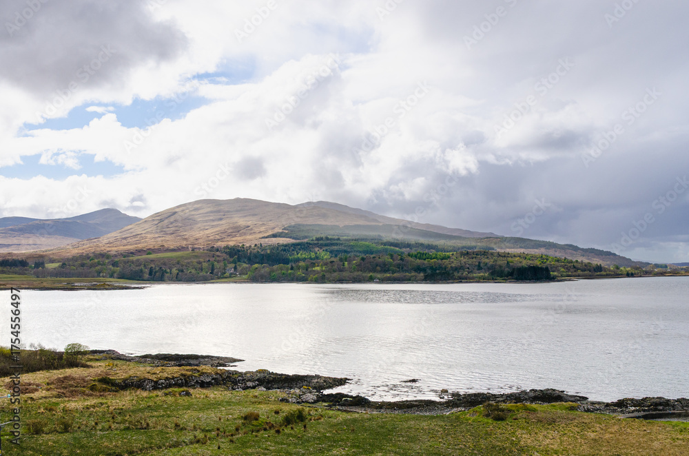 Isle of Mull - Beautiful view of a calm lake with rolling hills and mountains in the background under soft sunlight and dramatic clouds. #1754556497