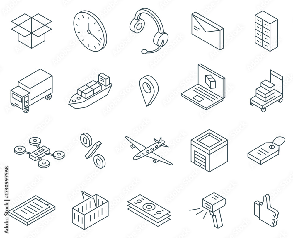 Isometric delivery icons. Delivery of goods, parcels, and purchases. Transport logistics, online trading, marketing. Outline nifty vector elements #1730997568