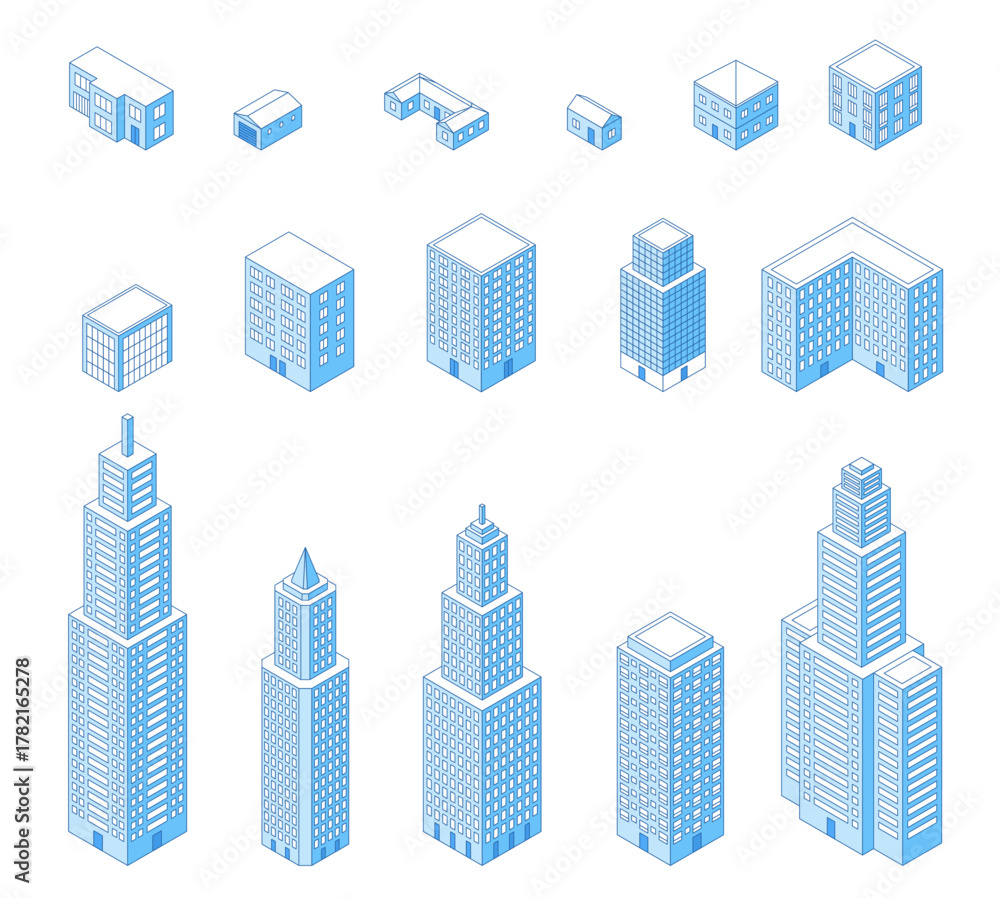 Isometric line houses. Apartment buildings, home, social and public architecture elements. 3d outline district, isolated building design, nifty vector set #1782165278
