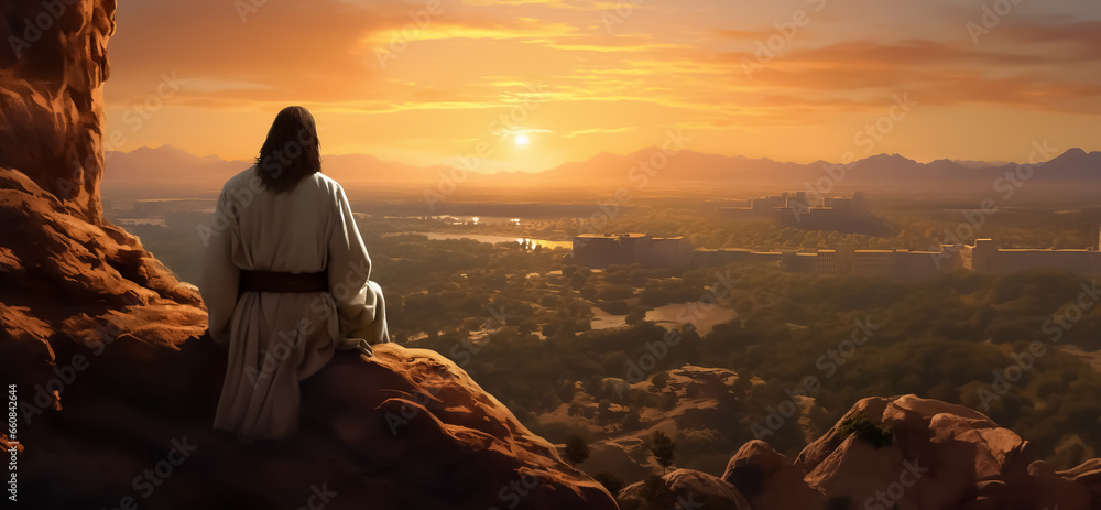 Jesus sits on a mountain and looks down on a valley - theme religion, faith and afterlife #660842644