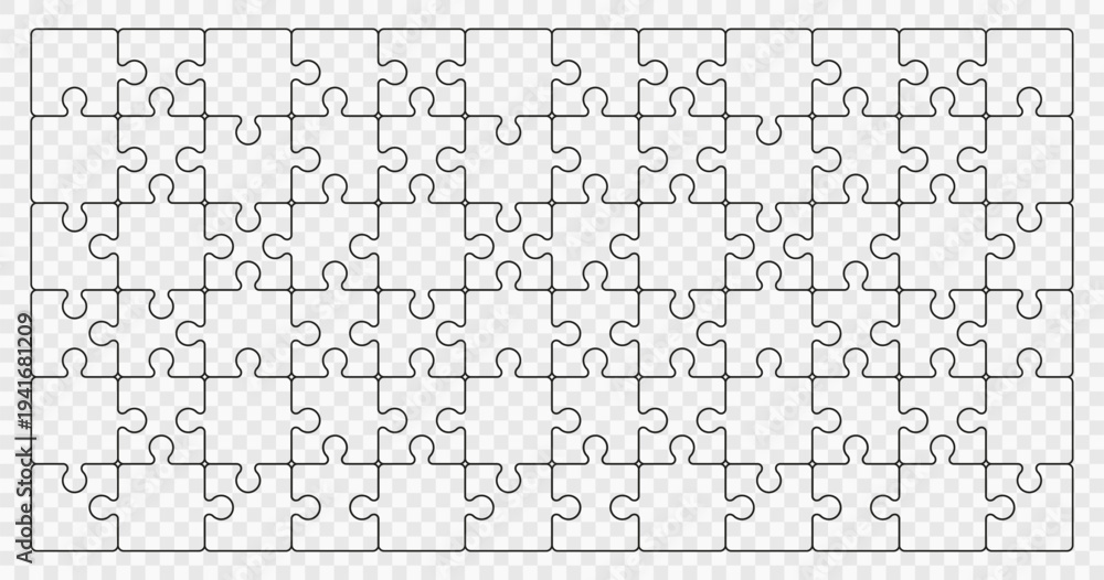 Jigsaw puzzle grid template outline. Connected puzzle pieces forming rectangular layout isolated on transparent background #1941681209